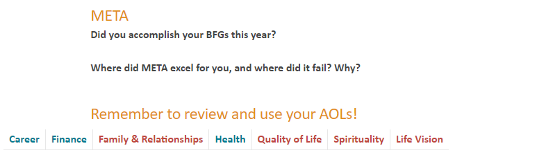 The next task is to review my Areas of Life (AOLs). I use these to plan the BFGs and the initiatives and projects which support them. My review process as well as the tracking systems have clearly expanded beyond just my art business, which is why I’m including all of it. They’re not separate things. (btw, “META” is what I call my main Obsidian vault, which I use to store, track, and manage so much of the inputs, projects, tasks, and goals in my life)