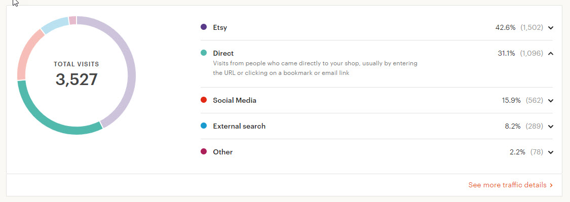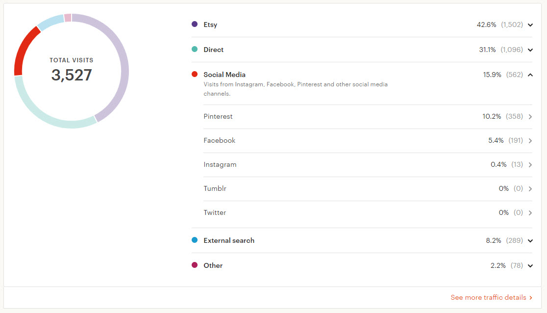 This is for just one of my Etsy shops, and these charts cover Jan – May 2018. Taking into account that part of the “other” traffic coming from my website is actually coming from Instagram via my bio link, it’s clear where I should focus any social media efforts. As far as the in-person shoppers, that’s my main income, so a lot of ‘marketing time’ on the computer should be spent booking the best events I can, which is another post entirely!